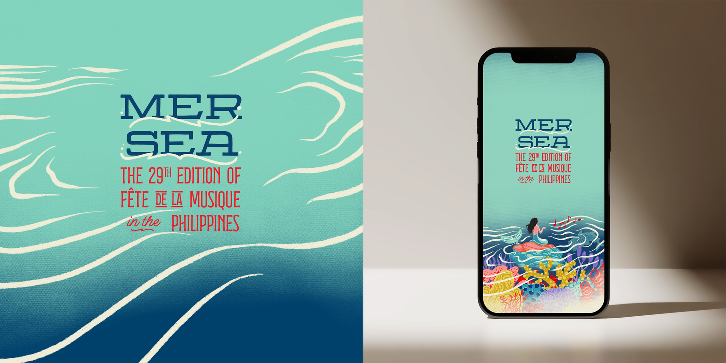 Based on the advocacy and theme for this year, we came up a detailed illustration connecting the sea to music and showing the beauty and the marine biodiversity of the Philippines. This theme is also applied to the typography, with a fun font being behind waves of water. This is the first time that the materials for Fete de la Musique are not limited to the colors of the French and Filipino flags, which is to say that the conservation of marine life is a global responsibility.
